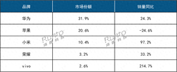 其中,华为销量同比增长24.3%,以31.9%的市场份额反超苹果,位列第一。